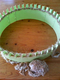 上部の突起(針山)に糸を掛けて指でつまんで編んでいきます。